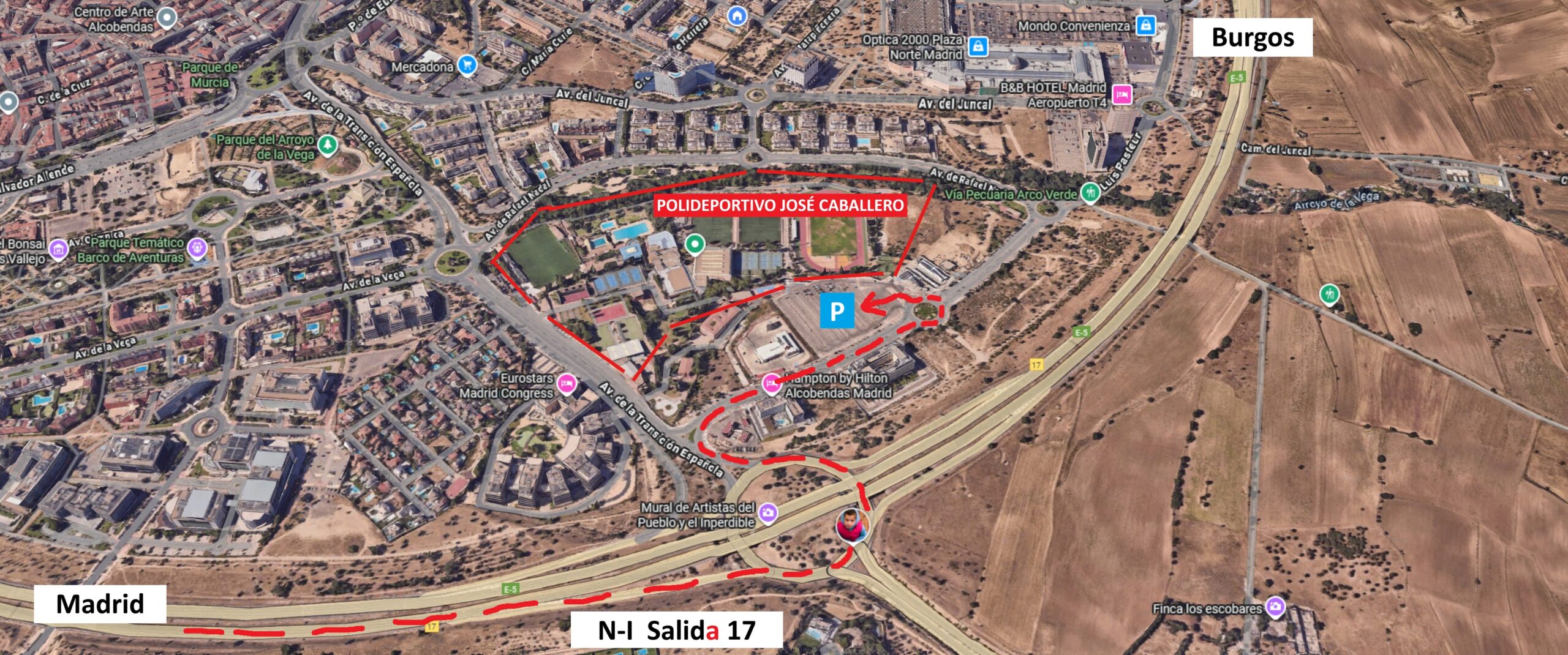 La forma más cómoda es aparcar en parking general del polideportivo, con gran capacidad y zona específica para autobuses. El parking se encuentra muy cerca de la salida 17 de la N-I. Hay salida tanto si circulas en sentido Burgos como en sentido Madrid.