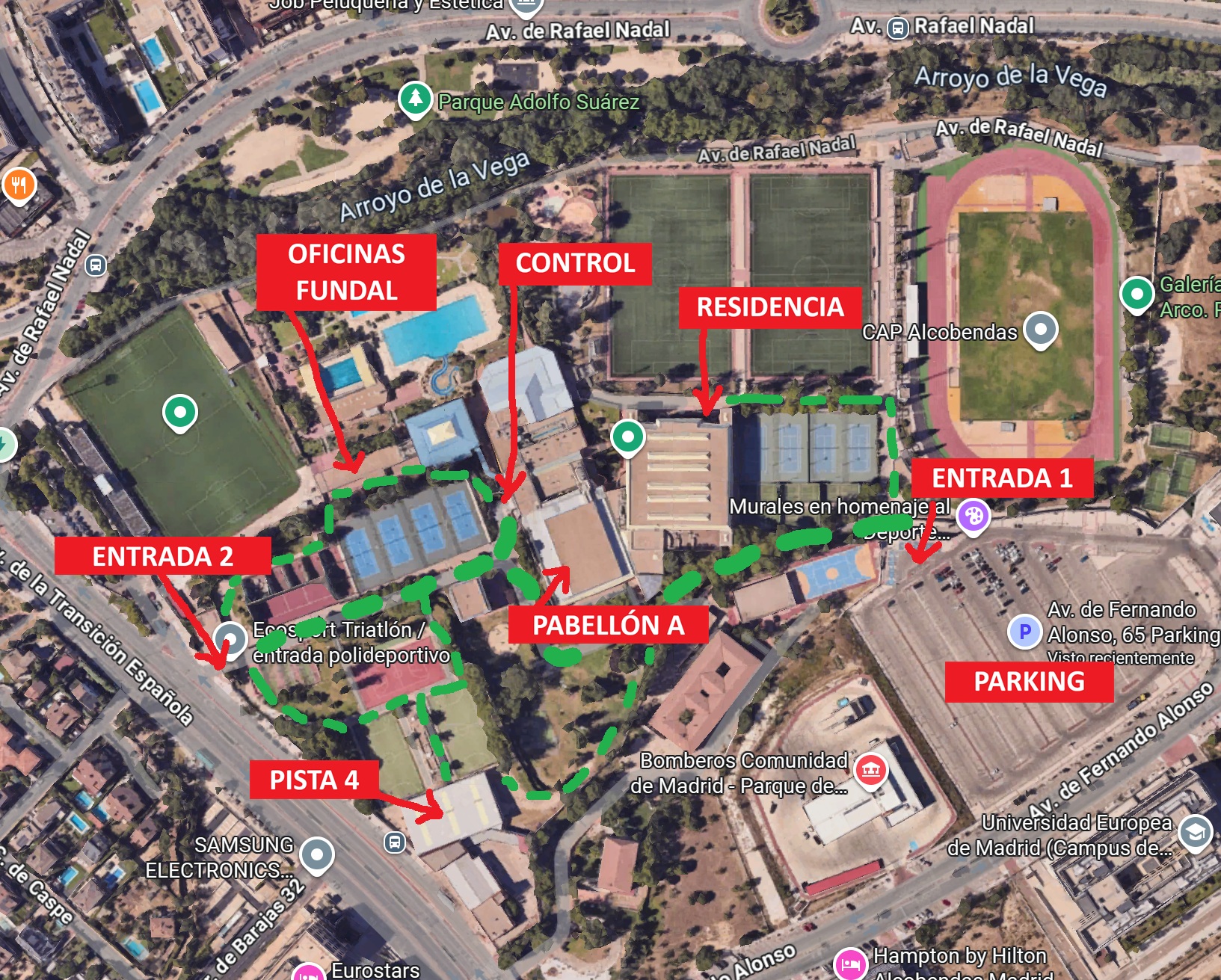 Línea verde: caminos peatonales dentro del recinto